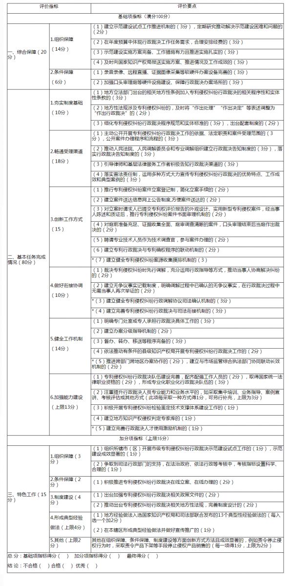 基礎項指標和加分項指標均對應不同的評價要點,主要依據試點地方提供的相應印證材料判斷是否得分。最終得分由基礎項指標得分和加分項指標得分兩部分組成。基礎項指標得分60分以下的為不合格。基礎項指標得分60分(含)以上的為合格,通過示范建設試點驗收。基礎項指標得分80以上且最終得分90分以上的為優秀,列入專利侵權糾紛行政裁決示范建設單位名錄。未達到優秀的,繼續加強專利侵權糾紛行政裁決工作,進一步積累向全國可復制可推廣可借鑒的經驗做法。具體如下: