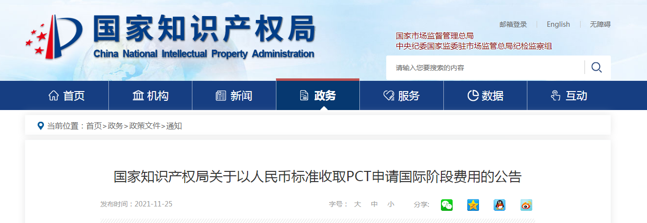 根據國家知識產權局與世界知識產權組織簽訂的《關于<專利合作條約>(PCT)費用匯交的諒解備忘錄》,自2021年12月1日起,國家知識產權局將按世界知識產權組織公布的人民幣標準收取PCT申請國際階段費用,不再以瑞士法郎標準進行折算。上述人民幣標準將在國家知識產權局網站專利合作條約(PCT)專欄另行通知。