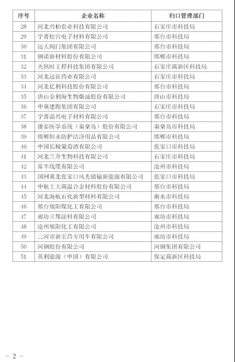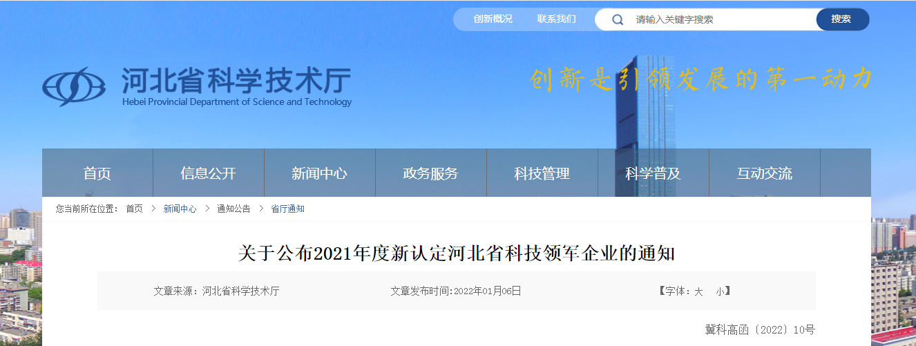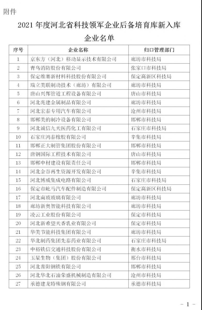 【科技廳】關于公布2021年度河北省科技領軍企業后備培育庫新入庫企業的通知