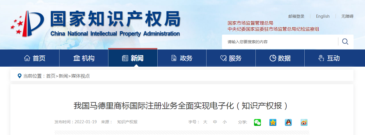 我國馬德里商標(biāo)國際注冊業(yè)務(wù)全面實現(xiàn)電子化(知識產(chǎn)權(quán)報)